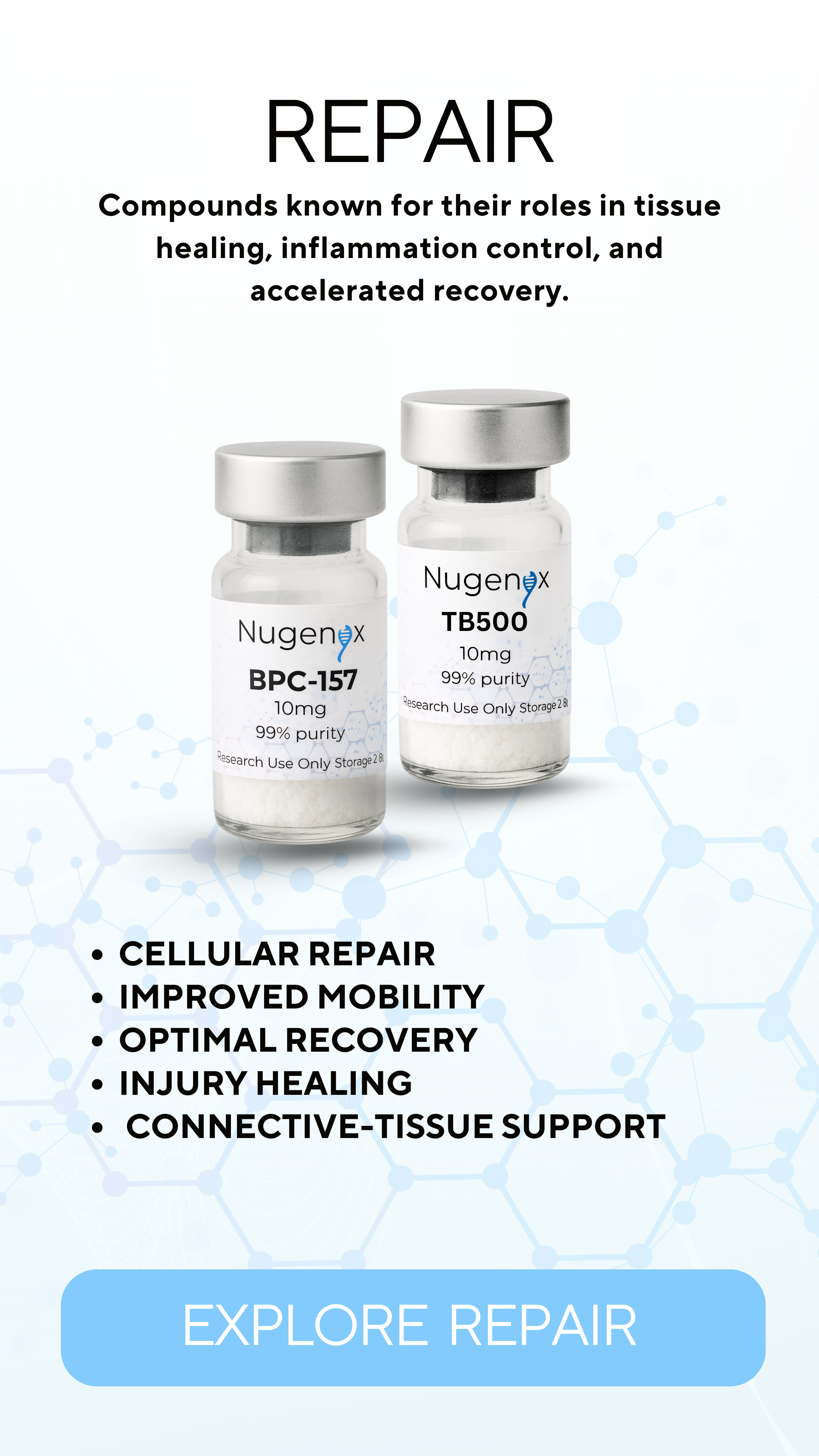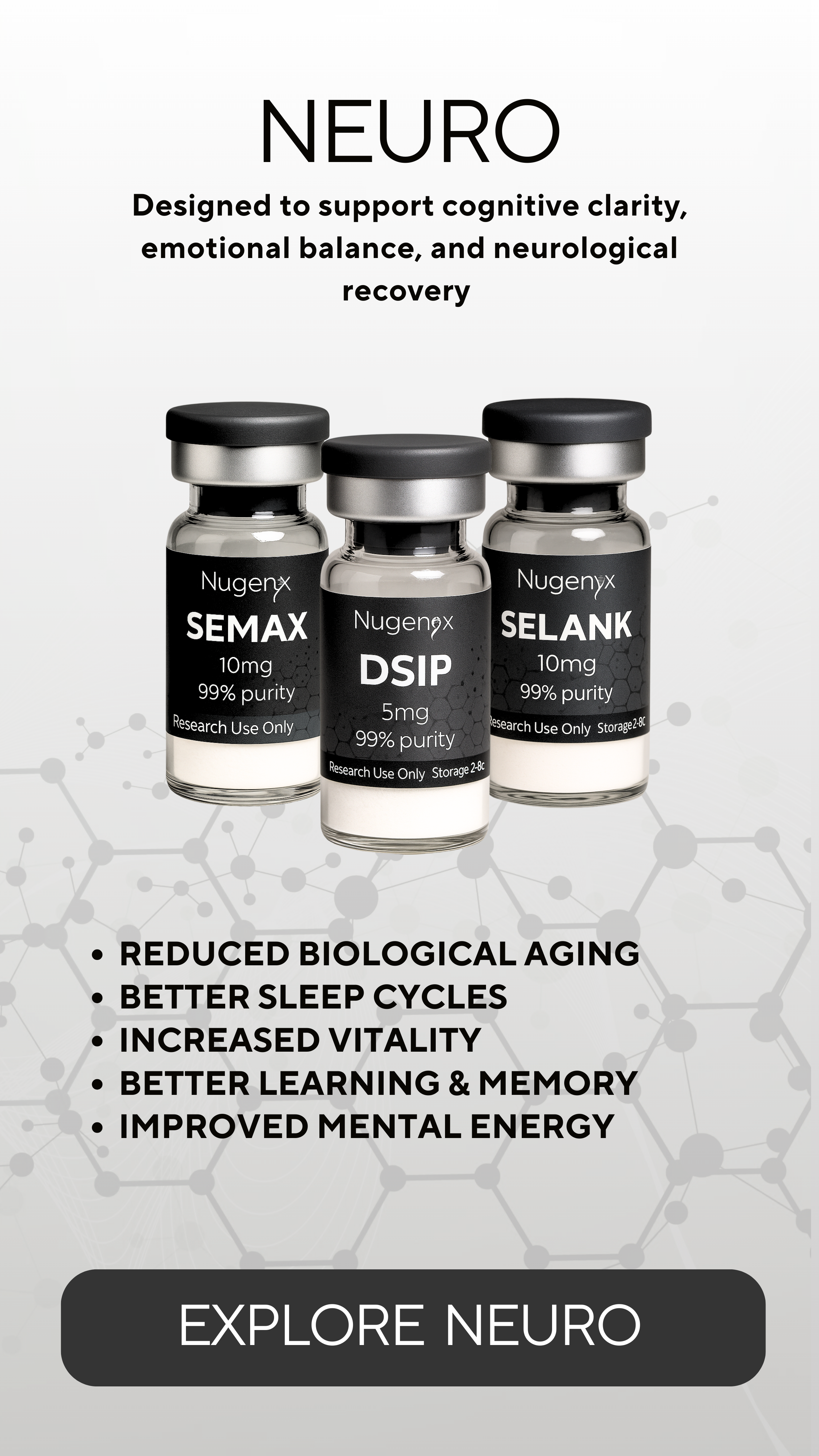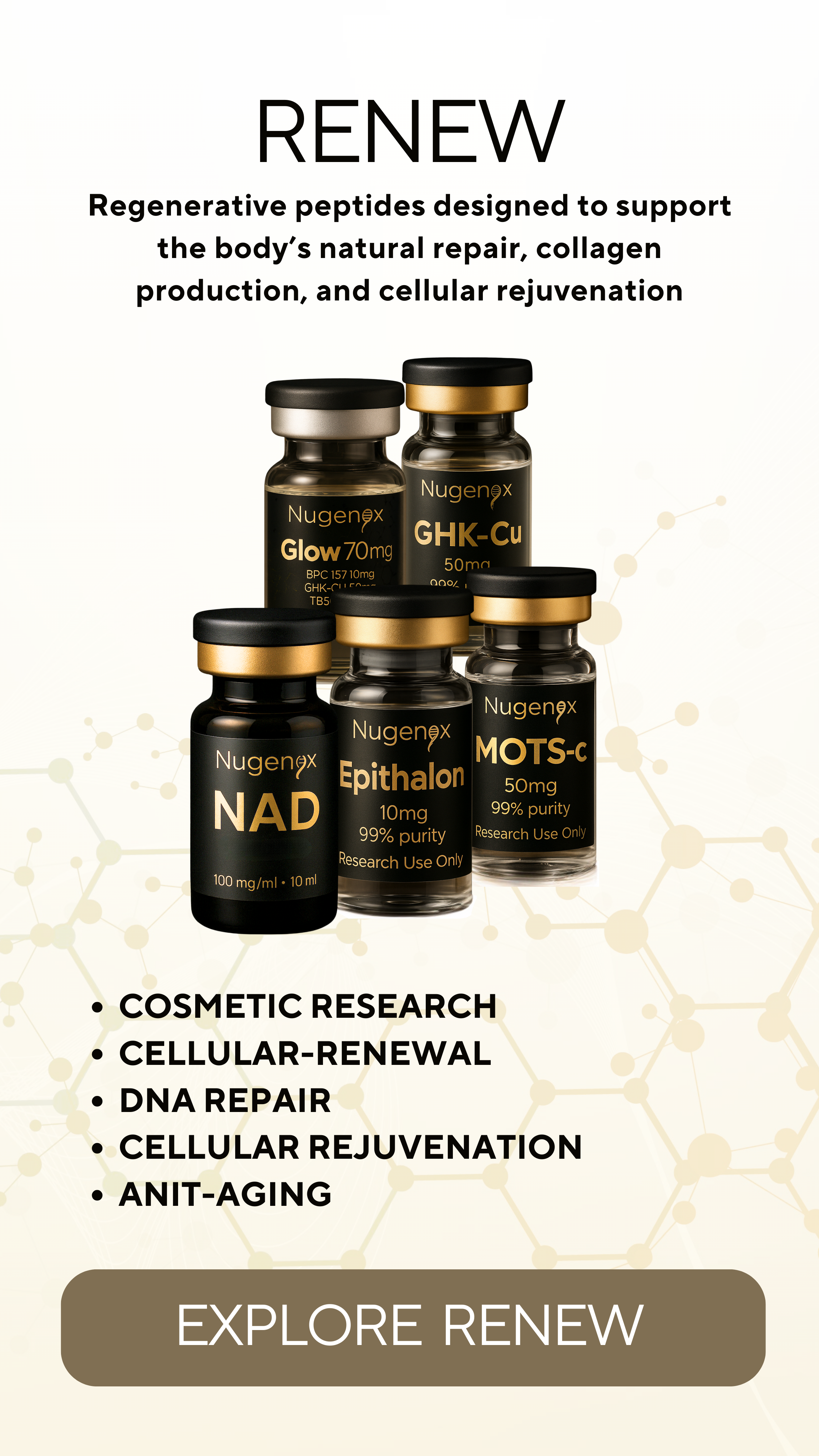 Each Nugenyx series focuses on a different dimension of human biology. Metabolic systems, skin and structure, restoration pathways, or neurological research—so you can explore the areas most relevant to your work or curiosity.